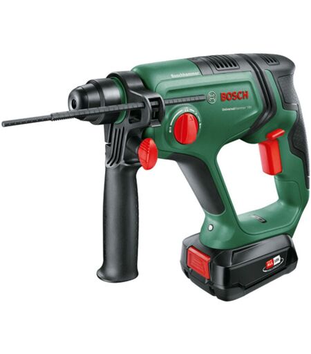 Martello perforatore a batteria UniversalHammer 18V. Senza filo e multifunzionale: foratura, perforazione a martello, scalpellatura e avvitatura. Design compatto e maneggevole per un'impressionante potenza 4-in-1. Martello pneumatico con 2,0 J per forare fino a 16 mm di diametro e scalpellare nel cemento. Mandrino universale SDS plus per un cambio facile e senza attrezzi di punte e scalpelli. Vibration Control e Rotation Control garantiscono una presa più sicura e una minore affaticamento. Compatibile con batteria Bosch 18V POWER FOR ALL. 1 x batteria PBA 18V 2,5Ah. Caricabatterie AL 18V-20. Fermalama per profondità. Manico ausiliario. Valigetta da trasporto. ...