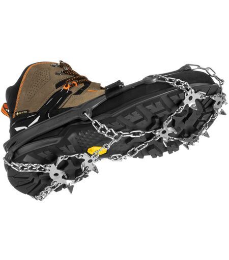 I ramponcini MTN Spike di Salewa sono stati concepiti per lo speed hiking invernale su terreni innevati e misti. Si adattano a calzature di ogni tipo e permettono rapidi e sicuri spostamenti su ghiaccio e neve compatta. robusta struttura con 18 chiodi in acciaio inox che garantiscono un'ottima trazione design della talloniera che offre stabilità e trazione in salita e in discesa calzata ferma e sicura grazie alla fettuccia rip-and-stick sul collo del piede resistenti catene in acciaio inox resistono alle ripetute torsioni facili e veloci da indossare grazie al sistema di fissaggio in elastomero custodia per il trasporto inclusa Guida alle taglie: EU: S=36-39, M=39-42, L=42-44, XL=44-47 UK: S=3.5-6, M=6-8, L=8-9.5, XL=9.5-12 ...