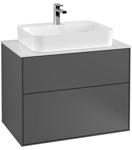 Villeroy & Boch Finion 1 x mobile lavabo in legno 2 cassetti Dimensioni: 800 x 603 x 501 mm Angolare Lavabo al centro Appeso a parete Pannelli di copertura in vetro Matt White La fornitura comprende: 1 x mobile lavabo, 1 x kit di montaggio Combinabile con: Memento 2.0 4A07 60/61, ordinare separatamente il lavabo definito ...