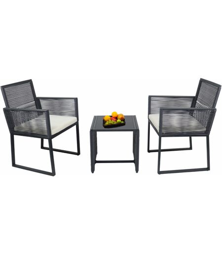 Highlights - Set composto da 2 sedie e 1 tavolo - Cuscini sedili comodi inclusi - Sedile e schienale realizzati in comodo rattan - tessuto è molto resistente allo strappo e ad asciugatura rapida - piano da tavolo realizzato in elegante vetro nero - alta qualità e durevole struttura in metallo ...