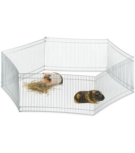 Avete bisogno di un recinto particolare in cui lasciare i vostri piccoli animali domestici mentre pulite la loro gabbietta? Il recinto da 6 elementi pieghevole è assemblabile in poco tempo tramite l’apposita asticella. Grazie alla struttura con maglie strette da 1 cm e alle singole griglie già unite l’una con l’altra, il recinto da interno è ideale per porcellini d’india, criceti e topolini. Ideale anche per chi vuole creare un recinto personalizzato: per originali aree giochi o per recinzioni con pavimento. Il recinto è adoperabile anche per uso esterno nel caso di tartarughe o porcellini d’india, a condizione che gli animali non vengano lasciati incustoditi. Recinto per animali di piccola taglia in dettaglio - 6 griglie in metallo HxL ciascuna: 27 x 48 cm - Misure montaggio rettangolare LxP: 95 x 50 cm - Diagonale del recinto esagonale: di 95 cm ca. - Larghezza maglie: 1 cm ca. - Peso complessivo: 1,5 kg ca. - Materiale: acciaio - Colore: argento Recinzione dal montaggio rapido per ...