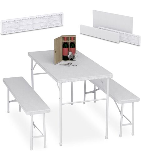 RELAXDAYS Tavolo da Birreria con Panche, Set da Giardino con Panchine e Tavolino Pieghevoli, Mobili Stile Rattan, Bianco -