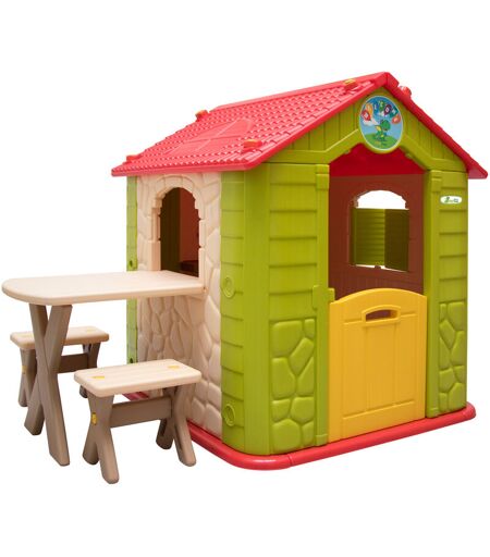 Il vostro bambino diventerà il padroncino della sua propria casa arredata con un pratico tavolino e due sgabelli che possono essere posizionati sia all'interno che all'esterno della casetta. Grazie al materiale resistente, i colori vivaci e le eleganti finiture (per es. le pareti in finta pietra e legno) la simpatica casetta non meraviglierà solo i bambini, ma anche voi e farà una bellissima figura sia in giardino che sul terrazzo ma anche dentro casa (per es. nella cameretta del bambino o in soggiorno). Grazie alle due finestrelle e all'entrata principale munita di porta, i bambini potranno giocare e felicemente comunicare fra loro. Il tetto farà sentire i bambini protetti e felici. L'interno offre spazio sufficiente per 2-3 bambini. In una delle pareti interne sono stati predisposti alcuni giochi interattivi che susciteranno immediatamente l'interesse dei piccoli stimoladoli e incoraggiando emozionanti ore di gioco. Nella casetta dei sogni di ogni bambino il gioco creativo non ha ...