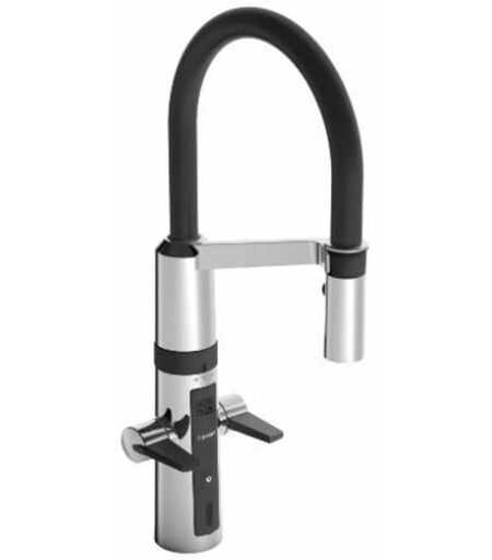 Miscelatore Hybrid per lavello, DN15 con braccio di erogazione flessibile, rialzato altezza: 492 mm sporgenza: 200 mm materiale: ottone, colore: nero/cromo montaggio, su piano con spessore fino a 40 mm alimentazione a rete: 230 V/50-60 Hz, tensione: 5 V DC Caratteristiche braccio di erogazione flessibile, girevole di 120° (alternativamente 60° nebo 80°) comando: leve separate Easy-Grip per l'acqua calda/fredda la temperatura dell'acqua per la funzione touchless è regolabile tramite l'anello girevole (disattivabile) display per l'indicazione della temperatura, con avviso acqua calda CACHÉ aeratore incorporato, con chiave di montaggio le superfici a contatto con l'acqua potabile sono prive di nickel l'ottone a contatto con l'acqua contiene meno dello 0,3% di piombo attacco flessibili a pressione: G 3/8, con filtro anti-sporcizia erogazione: 12 l/min Funzioni elettroniche deflusso dell'acqua: 2-20 s (preimpostato a 4 s) risciacquo igienico: 12/24/48/72 ore (disattivabile) durata ...