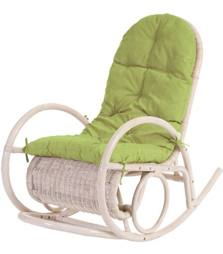 Sedia a dondolo con cuscino struttura in legno e rattan modello Esmeraldas T631 versione cuscino VERDE Le sedie a dondolo rappresentano la base ideale per chi desidera rilassarsi a casa, magari guardando la TV, con un buon libro o addirittura davanti al computer. Da sempre le sedie a dondolo sono il compagno ideale per trascorrere in tranquillità le giornate in casa, integrandosi alla perfezione con qualsiasi ambiente domestico. Il design retrò con linee sinuose di questo modello di sedie a dondolo è l'ideale per riproporre un design assolutamente classico! La struttura è in legno robusto, mentre la seduta e lo schienale sono in pregevole rattan e, a completare questa deliziosa sedia, un comodissimo cuscino (materiale: 65% poliestere e 35% cotone) compreso nella consegna disponibile in diversi colori. telaio robusto in intreccio di rattan bianco imbottitura spessa 8cm con cuciture con decorazione in rattan nella parte alta dello schienale facile da montare design classico peso ridotto ...