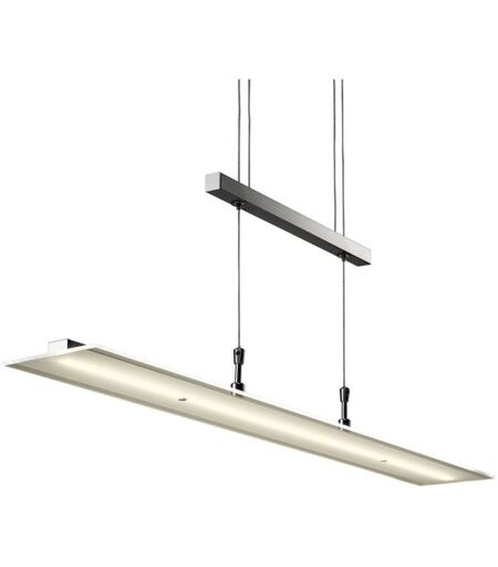 Una luce bianca calda da 3000 Kelvin e 1 x 1600 Lumen illumina l'ambiente. L'intensità della luce è regolabile tenendo premuto il bottone posto su un lato corto del lampadario La lampada a sospensione si fissa al soffitto e ha un'altezza regolabile quindi è particolarmente adatta ad essere posizionata sopra un tavolo. Per modificare l'altezza premere i pulsanti posizionati sulla barra passacavi La forma moderna e il design minimal permettono di inserire il lampadario in modo armonioso in varie stanze, in particolare in cucina o sala da pranzo 1 lampadario con LED integrati dimmerabili non sostituibili. Ridotti consumi energetici (1 x 20W). Lunghezza del vetro 850mm. Regolabile in altezza 900-1750mm Il nostro servizio clienti è unico come il design moderno delle nostre lampade - qualità che vi convincerà , designed in Germany ...