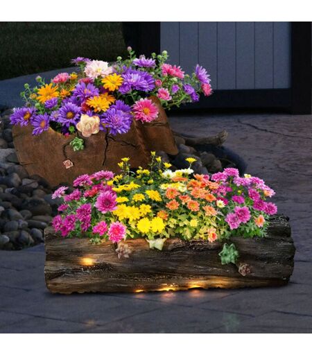 ETC-SHOP Fioriera a energia solare Luce decorativa illuminata per la casa e il giardino, 1x tronco d'albero 1x vaso di fiori antico, led bianco caldo, set di 2