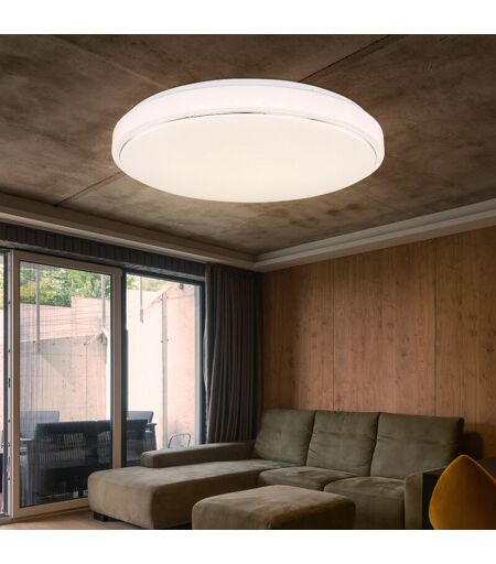 Descrizione La lampada da soffitto rotonda (49 cm) KALLE colpisce per la sua funzionalità. Realizzata in metallo bianco e plastica opalina dall'aspetto scintillante, questa plafoniera con anelli cromati ha la possibilità di cambiare il colore della luce in bianco caldo (3000 Kelvin), bianco neutro (4000 Kelvin) e bianco freddo (6000 Kelvin) utilizzando una parete interruttore (non incluso). Questa lampada con lampadina LED da 32 watt inclusa fornisce fino a 3300 lumen di luce. La lampada può essere utilizzata universalmente nel tuo salotto. Puoi completare il tuo spazio abitativo con altri modelli di questa serie. dettagli apparecchio • Tipo di lampada: plafoniera • Materiale: metallo, anello cromato • Paralume: plastica, opale • Effetto stella• Colore della luce tramite interruttore a parete (non incluso) regolabile • funzione memory • diametro x altezza in cm: 49 x 7,5 • Sorgente luminosa: 1x LED • Sorgente luminosa inclusa: sì • Sorgente luminosa di potenza: 1x 32 Watt • Flusso ...