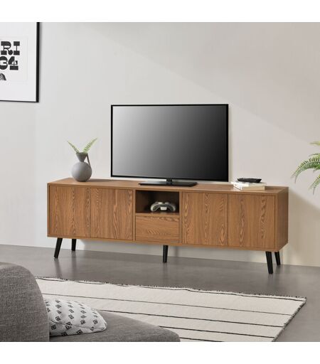 Mobile Porta TV Il mobile oltre a supportare il televisore offre numerosi spazi nel suo interno tra cui anche agli strumenti multimediali. Le ante senza maniglia possono essere aperte con una pressione leggera grazie al meccanismo Push to Open. Descrizione: - mobile porta tv di design - l'interno del mobile é diviso con ripiano in ogni scomparto - dotato di 1 scomparto aperto - 4 ante grandi e 1 anta piccola con sistema Push-Open - stabilitá grazie a 5 piedini - supporto max. 20 kg Materiale: - corpo: truciolare melaminico - gambe: legno massiccio Misure: - Totale (LuxLaxA): 140 x 30 x 45,5 cm - Scomparto (LuxLaxA): 26,8 x 29,5 x 14 cm - Spazi interni (LuxLaxA): cadauno 53,5 x 27 x 14 cm - Anta (LuxA): cadauna 26,3 x 29,7 cm Colore: Effetto legno scuro La spedizione include: 1 x mobile TV Prodotto di [en.casa] ...