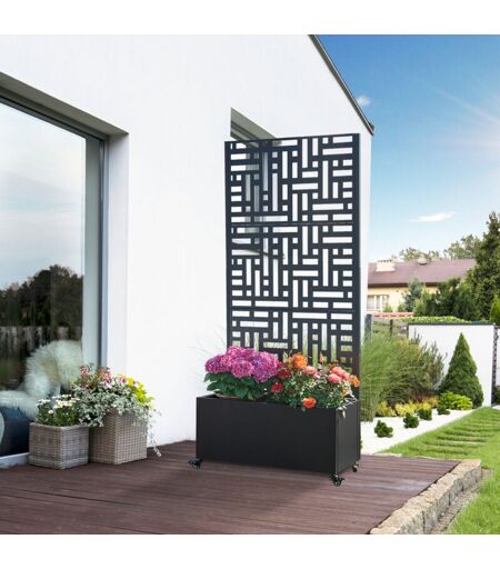 Fioriera con spalliera Questo divisorio rappresenta un'innovativa soluzione di design che unisce estetica e funzionalità, progettato per definire gli spazi e introdurre una nota di freschezza e vitalità. Caratterizzato da un pannello divisorio con grigliato per piante rampicanti e un contenitore sottostante, questo elemento si distingue per la sua versatilità e molteplici vantaggi. Il pannello divisorio, largo quanto il contenitore (82 cm) e alto 190 cm, non solo crea una barriera visiva elegante, ma funge anche da grigliato per piante rampicanti. La superficie traforata con motivi ispirati alla fantasia greca, aggiunge un tocco decorativo raffinato. Il grigliato offre un supporto ideale per piante rampicanti, trasformando il divisorio in una parete verde. Il contenitore rettangolare sottostante è parte integrante del design complessivo. Realizzato in acciaio di colore nero, il contenitore offre spazio dedicato per piante e fiori. Le quattro rotelle, di cui due dotate di fermaruote, ...