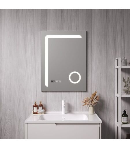 Specchio LED Lo specchio LED da parete rappresenta un'innovazione sorprendente. La retroilluminazione a forma di L conferisce un'atmosfera moderna alla stanza. La luce bianca emessa è regolabile, permettendoti di scegliere tra tonalità fredda, neutra e calda. L'intensità della luce è altrettanto flessibile, consentendoti di adattare l'illuminazione alla situazione e all'ambiente circostante. La funzione antiappannamento garantisce sempre una superficie chiara, senza condense e pronta all'uso. Per tenere traccia del tempo mentre ti prepari, lo specchio LED dispone anche di un orologio digitale ben visibile. Inoltre, lo specchio è dotato di una lente di ingrandimento, circondato da luci, ideale per i dettagli più precisi della tua routine di bellezza. Caratteristiche: - Temperatura della luce bianca regolabile: freddo, neutro, caldo - Alimentazione tramite connessione elettrica - Comandi a sfioramento - L'intensitá della luce regolabile fra 10% e 100% - Funzione antiappannamento ...