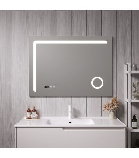 Specchio LED Lo specchio LED da parete rappresenta un'innovazione sorprendente. La retroilluminazione a forma di L conferisce un'atmosfera moderna alla stanza. La luce bianca emessa è regolabile, permettendoti di scegliere tra tonalità fredda, neutra e calda. L'intensità della luce è altrettanto flessibile, consentendoti di adattare l'illuminazione alla situazione e all'ambiente circostante. La funzione antiappannamento garantisce sempre una superficie chiara, senza condense e pronta all'uso. Per tenere traccia del tempo mentre ti prepari, lo specchio LED dispone anche di un orologio digitale ben visibile. Inoltre, lo specchio è dotato di una lente di ingrandimento, circondato da luci, ideale per i dettagli più precisi della tua routine di bellezza. Caratteristiche: - Temperatura della luce bianca regolabile: freddo, neutro, caldo - Alimentazione tramite connessione elettrica - Comandi a sfioramento - L'intensitá della luce regolabile fra 10% e 100% - Funzione antiappannamento ...