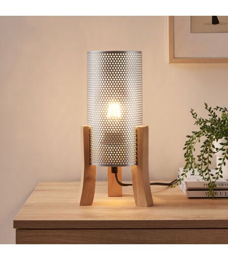 Lampada da tavolo Dal perfetto equilibrio tra calore naturale e rigore geometrico, questa lampada da tavolo si distingue per un design essenziale e al tempo stesso ricercato. La struttura in legno chiaro, composta da elementi curvati che si incrociano alla base, sostiene con leggerezza un paralume cilindrico in metallo traforato, creando un contrasto armonioso tra materiali e texture. L’effetto visivo è elegante e moderno, ma con un tocco caldo e accogliente che la rende adatta anche ad ambienti più tradizionali o arredati in stile scandinavo. La luce si diffonde delicatamente attraverso la superficie microforata del paralume, generando giochi di luce morbidi e avvolgenti che valorizzano l’atmosfera della stanza senza risultare invadenti. È una lampada che non si limita a illuminare, ma contribuisce attivamente all’estetica dell’ambiente, diventando un vero e proprio elemento decorativo. Le dimensioni compatte la rendono perfetta per diversi spazi della casa: su un comodino, una ...