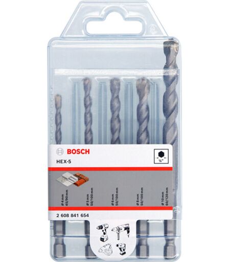 Bosch - Professional Set di 5 Punte da Calcestruzzo HEX-5 (per Calcestruzzo, ø 4/5/6/8/10 mm, Accessori Perforatrice a Percussione)