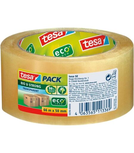 Tesa Pack Bio & Strong - Nastro adesivo forte per pacchi - Materiale biologico al 98% - Sostenibile e riciclabile - Trasparente - 66 m x 50 mm -