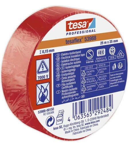 Tesa - Nastro isolante omologato 25m x 25mm colore rosso per isolare o marcare cavi