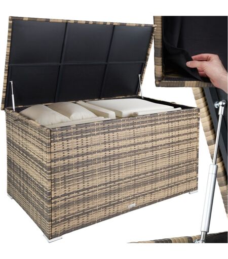 Questo spazioso baule di tectake mette a disposizione un posto spazioso e ben protetto, dove riporre cuscini, giocattoli e attrezzi da giardino di ogni tipo. Il coperchio rinforzato con listelli e un inserto si sovrappone alle pareti laterali, impedendo così ulteriormente la penetrazione di umidità e bagnato. Le due molle a gas consentono una facile apertura e chiusura del coperchio e ne impediscono un involontario alzarsi o chiudersi a causa di influssi esterni. Il fine rivestimento intrecciato in resistente polyrattan e la solida intelaiatura in alluminio rendono questo inossidabile baule di tectake perfetto per l'utilizzo all'aperto. Caratteristiche Stabile baule dall'enorme capienza Rivestimento intrecciato d’alta qualità in polyrattan resistente ai raggi UV Robusto telaio in leggero alluminio Costruzione resistente alle intemperie e assolutamente inossidabile Coperchio rinforzato, con molle a gas per la facile apertura e chiusura Rivestimento interno staccabile Maniglie ai lati ...