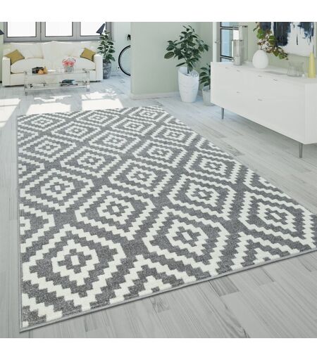 PACO HOME Moderno tappeto a pelo corto per il soggiorno con motivo di rombi geometrico in grigio e bianco 140x200 cm -