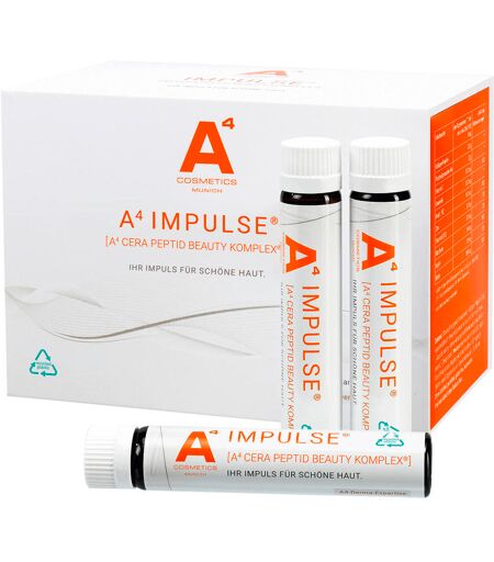 Integratore alimentare di alta qualità per la pelle. 28 fiale da bere da 25 ml. Contiene l'A4 Cera Peptide Beauty Complex® appositamente sviluppato - una combinazione di ceramidi di alta qualità e peptidi di collagene, nonché altri nutrienti importanti per la pelle. A4 IMPULSE® è disponibile in pratiche fiale da bere che consentono un'applicazione facile e comoda e sono quindi adatte anche per l'uso in movimento. L'integratore alimentare contiene fruttosio. È senza purina, lattosio e glutine. A4 IMPULSE® non contiene né alcool né coloranti artificiali. Le fiale da bere A4 IMPULSE® contengono numerosi ingredienti preziosi che sostengono la vitalità della tua pelle dall'interno. L'A4 Cera Peptide Beauty Complex®, appositamente sviluppato, consiste in peptidi di collagene e ceramidi di alta qualità. Il collagene e le ceramidi sono componenti elementari della pelle ed entrambi contribuiscono ad un aspetto giovane e fresco. Il collagene dà alla pelle struttura e stabilità. Le ceramidi gli conferiscono una particolare elasticità e idratazione. La bevanda di bellezza contiene anche vitamina C e vitamina E. La vitamina C supporta la formazione naturale di collagene nella pelle, mentre la vitamina E aiuta a proteggere la pelle dallo stress ossidativo causato dai dannosi radicali liberi. Questi si attivano attraverso le radiazioni solari o lo stress, tra le altre cose, attaccano le cellule della pelle e quindi accelerano anche l'invecchiamento della pelle. Inoltre, i micronutrienti zinco e biotina contribuiscono a una pelle normale. Applicazione: Prendere una fiala di bevanda al collagene al giorno prima o con un pasto. Suggerimento: Integrare A4 IMPULSE® nel tuo rituale quotidiano di colazione. Durante il giorno, il metabolismo è più attivo - i nutrienti contenuti sono quindi meglio distribuiti nel corpo. A4 raccomanda di prendere il prodotto per almeno 12 settimane in totale per contrastare i cambiamenti della pelle legati all'età a lungo termine. A4 COSMETICS Skin Care - Cosmetici attivi su base naturale Cura della pelle attivante di A4 COSMETICS Skin Care. Sentitevi completamente a vostro agio nella vostra pelle - con una cura altamente efficace e compatibile con la pelle su base naturale che protegge e vitalizza visibilmente la vostra pelle. La cura della pelle ad attivazione naturale evita deliberatamente siliconi, parabeni e sostanze chimiche attive a livello ormonale. Invece, A4 COSMETICS Skin Care si affida a principi attivi naturali come quelli contenuti nell'olio di avocado e di argan, nell'aloe vera o nel burro di karité. Scopri i nostri efficaci prodotti per la cura della tua pelle - dal doccia schiuma rinvigorente alla crema per il corpo e alla lozione per il corpo fino alla cura della pelle anti-età per il viso e gli occhi con visibili effetti anti-età immediati e a lungo termine. ...