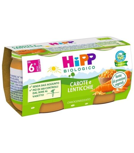 HiPP Omogeneizzato Carota e Lenticchie 2x80g, indicato dal 6° mese. Fonte di proteine vegetali, senza sale aggiunto, aromi, coloranti e conservanti. Senza OGM. ...