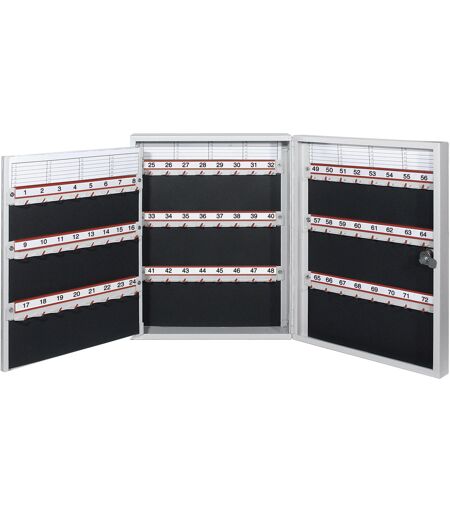 Descrizione Esecuzione: Corpo, parete divisoria e sportello in lamiera. Predisposto per il fissaggio a muro. Rivestimento interno con un foglio in polipropilene. Fascia a ganci con regolazione continua dell'altezza, con numerazione progressiva e registro chiavi. Chiusura mediante serratura a cilindro DOM. Con pannello divisore orientabile e 96 ganci portachiavi (12righe da 8 ganci). Verniciatura: Termoverniciato in grigio chiaro RAL 7035. Dati tecnici Serratura a cilindro inserto modulare a bussola Tipo di prodotto Armadietto portachiavi ⌀ Chiusura a combinazione, mm 57 Larghezza, mm 285 Altezza, mm 380 Profondità, mm 110 Numero di ganci portachiavi 96 ...