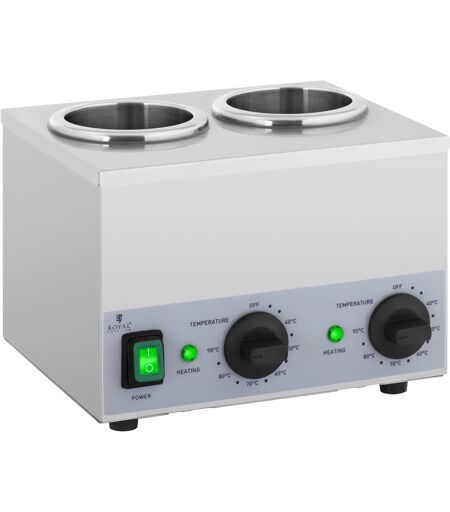 I tuoi clienti amano le salse calde? Allora offrigli salse appena riscaldate e facili da porzionare direttamente dalla bottiglia! Riscalda le bottiglie di salsa in modo rapido ed efficace nello scalda salse di Royal Catering! Che si tratti di formaggio, peperoncino o salse barbecue per nachos o salsicce, nello scalda salse saranno sempre alla giusta temperatura. Ma anche una crema di cioccolato per crêpes o waffle avrà sempre la giusta consistenza. Lasciati sorprendere dalla funzionalità semplice e intuitiva dello scalda salse per bottiglie da 1 litro. Basta inserire la bottiglia di salsa nelle due aperture e usare semplicemente l'interruttore rotante per selezionare la temperatura che ti serve tra 40 e 90 °C. L'interruttore di accensione/spegnimento mette in funzione il dispositivo, che è confermato da diodi luminosi. Grazie a una potenza di 400 W, si raggiunge rapidamente la temperatura desiderata. Il pannello di controllo nella parte inferiore del dispositivo è molto chiaro e ti permette di tenere sempre sotto controllo il riscaldamento delle tue salse. Per ogni contenitore di bottiglia è disponibile un regolatore di temperatura che consente di preparare contemporaneamente salse diverse a temperature diverse. Il robusto alloggiamento in acciaio inox avrà sempre un aspetto splendente sulla tavola di un buffet o nel food truck. Le superfici lisce sono facili da pulire e anche con un uso intensivo mostreranno appena segni di usura. Quattro piedini in gomma assicurano la stabilità del dispositivo. ...