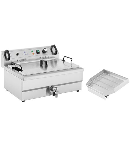 La friggitrice per pasticceria di Royal Catering è stata progettata per un uso professionale e duraturo nelle pasticcerie, ristoranti, supermercati, bar o food truck. Con una potenza di 3000 W e 23 litri di capacità si possono preparare grandi quantità di patatine fritte, pesce o anelli di cipolla, oltre a frittelle, ciambelle e bomboloni. Questa friggitrice elettrica convince per i suoi pratici extra, come il ripiano laterale o il rubinetto di scarico, che la rendono più comoda da usare rispetto a molte altre friggitrici. L'alloggiamento in acciaio inox è robusto, resistente alla corrosione e dal sapore neutro. Le superfici lisce sono facili da pulire. Il contenitore da 30 L della friggitrice può contenere fino a 23 litri di olio e questo consente di friggere rapidamente e senza sforzo grandi quantità in una sola volta e di risparmiare tempo prezioso. Il potente elemento riscaldante da 3000 W raggiunge rapidamente la temperatura massima di 200 °C. Un termostato di alta qualità e molto accurato mantiene il calore dell'olio sempre alla temperatura desiderata. Gli extra ben studiati della friggitrice per catering consentono di lavorare in modo ottimale nelle cucine professionali e nelle panetterie. Il vassoio laterale fa anche sì che il grasso in eccesso defluisca nel contenitore. Il coperchio incluso nella spedizione protegge l'olio dalla contaminazione. Il pratico rubinetto di scarico facilita la pulizia della friggitrice. Con questo prodotto, Royal Catering punta sulla funzionalità, sulla semplicità d'uso e su un design pratico. ...
