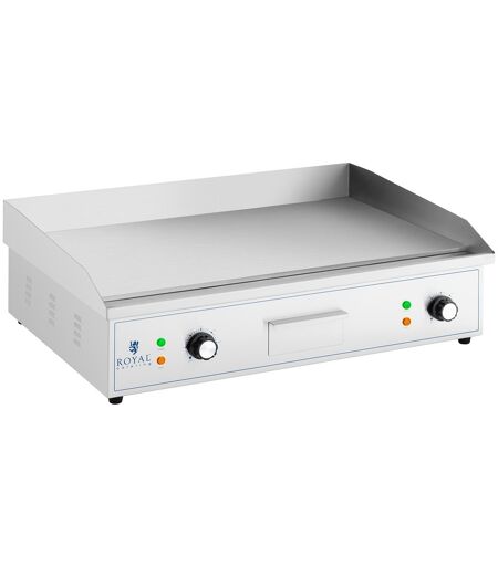 Con il fry top elettrico dalle attrezzature per la gastronomia di Royal Catering i tuoi ospiti possono gustarsi buonissime specialità grigliate. Che si tratti di bistecche o hamburger, pesce, frittate, tortillas o verdure, con questa piastra elettrica professionale la tua immaginazione non avrà limiti. La piastra di cottura colpisce grazie alla ridotta qauntità di fumo e per il funzionamento igienico e molto pulito. Inoltre, la piastra grill elettrica si presta perfettamente all'utilizzo in grandi cucine, come quelle dei ristoranti e chioschi, fino a quelle dei foodtruck o eventi catering. Il termostato completamente automatico assicura che la temperatura rimanga costante. Grazie al potente elemento riscaldante che funziona a 4400 W, il fry top elettrico raggiunge velocemente la temperatura di esercizio compresa tra 50 e 300 °C, la quale può essere regolata per mezzo di una pratica manopola girevole. La piastra del fry top elettrico è realizzata in ghisa e conduce il calore in modo rapido dagli elementi riscaldanti alle pietanze e, allo stesso tempo, lo mantiene. La piastra di 10 mm di spessore misura 727 x 420 mm. Grazie alla sua superficie ondulata, il grasso in eccesso scorre via da carne e salsicce. Grazie alla superficie liscia, la piastra elettrica professionale è perfetta per preparare uova al tegamino o pancake. La piastra è circondata da un paraschizzi che protegge in modo efficace le pareti e l'area circostante da eventuali schizzi di grasso. L'alloggiamento del fry top elettrico è realizzato in acciaio inox di alta qualità ed è quindi particolarmente resistente alla corrosione, neutro al contatto con gli alimenti e facile da pulire. La pulizia sarà quindi semplice grazie all'efficace rimozione del grasso. La piastra elettrica ha un cassetto estraibile in cui viene raccolto il grasso in eccesso grazie ad un sistema di scarico. La vaschetta è facile da rimuovere e pulire. La stabilità del dispositivo è garantita da piedini in gomma antiscivolo che non graffiano il piano di lavoro. ...