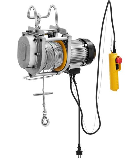 Con il paranco elettrico di MSW sollevi carichi pesanti senza fatica in magazzino o in officina. Grazie all'ampio raggio di lavoro, sollevi la merce e gli oggetti pesanti negli spazi chiusi in modo comodo grazie al telecomando. Il paranco può essere fissato a piacere sia ad una parete, sia a un ponteggio o ad un braccio mobile. Usa i 1300 W del potente motore per sollevare carichi a un'altezza impressionante di 60 metri. La fune con un diametro di 5,1 mm trasporta carichi di 250 kg. Con una velocità di sollevamento di 15 m al minuto sarai sempre in prima linea. Che tu voglia sollevare o riporre carichi, con il paranco elettrico i lavori di sollevamento sono rapidi e potenti. Il cavo di trazione può essere controllato premendo un pulsante tramite il telecomando. In caso di pericolo, premi il pulsante di emergenza sul telecomando e il cavo si fermerà subito. I ganci sono dotati ciascuno di un blocco di sicurezza e il dispositivo si spegne automaticamente nella posizione più alta e più bassa. L'alloggiamento in acciaio è estremamente robusto e riduce quindi il rischio di segni di usura come graffi, scheggiature e corrosione. Contrassegnato con la classe di protezione IP54, il paranco elettrico è protetto da sporco e acqua e il dispositivo è inoltre dotato di protezione da sovraccarico termico. ...