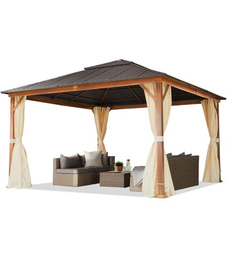 TOOLPORT Gazebo da giardino 4x4 m look legno, tetto Hardtop in acciaio, 4 teli laterali color crema
