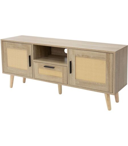 ML-DESIGN Mobile tv 120x50,5x30 cm Effetto Rovere Tavolo tv con 2 Ante Cassetto Ripiano Pannello tv in Rattan Piedini in Legno Massiccio per Soggiorno Fino a