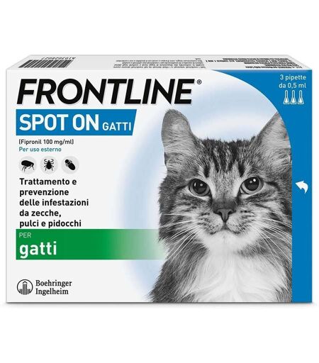 Codice Aic: 103028027Frontline Spot-On GATTI*soluz 3 pipette 0,5 ml 50 mgFipronil 10 g/100 ml.INDICAZIONE Trattamento e prevenzione delle infestazioni da zecche (Rhipicephalus spp., Dermacentor spp., Ixodes spp), da pulci (Ctenocephalides spp) e da pidocchi nei gatti adulti e nei gattini. - Il fipronil esplica rapidamente la sua azione letale sulle zecche, impedendo lo sviluppo del parassita e l’eventuale trasmissione di infezioni di cui la zecca sia vettore. E’ attivo contro le principali specie di zecche presenti sul territorio nazionale, tra cui Ixodes ricinus, responsabile della trasmissione della malattia di Lyme al cane, al gatto e all’uomo. - Il fipronil agisce sulle pulci uccidendo rapidamente le forme adulte, prevenendo così la deposizione di uova e quindi nuove infestazioni. - Grazie all’azione letale sulle pulci adulte, il fipronil contribuisce efficacemente al controllo ed alla risoluzione della Dermatite Allergica da Pulci (Dap) che, nel gatto, è provocata dall’azione sensibilizzante esercitata dagli antigeni contenuti nella saliva di tali parassiti. - Il fipronil inoltre, con un singolo trattamento, controlla e risolve in modo rapido e definitivo le infestazioni da pidocchi, in particolare quelle provocate da Felicola subrostratus, pidocchio masticatore del gatto. Il fipronil elimina le pulci entro 24 ore; le zecche e i pidocchi entro 48 ore dall’infestazione.CONTROINDICAZIONI In mancanza di dati, non utilizzare il prodotto nei gattini di età inferiore alle 8 settimane o di peso inferiore a 1 kg. Non utilizzare in animali malati (malattie sistemiche, con febbre,….) o convalescenti. Non usare nei conigli, poiché potrebbero manifestarsi reazioni avverse potenzialmente mortali. Non usare in caso di ipersensibilità al principio attivo o ad uno degli eccipienti.PRECAUZIONI D´impiego Nei gatti, non sono disponibili informazioni che dimostrino quanto immersioni in acqua o bagni possano interferire sull’attività del prodotto. Comunque, in base ai dati ottenuti da cani lavati a partire da 2 giorni dopo l’applicazione del prodotto, si consiglia di evitare i bagni nei 2 giorni successivi l’applicazione del prodotto. Qualora il gatto sia stato trattato prima dell’esposizione alle zecche queste saranno eliminate nelle prime 24-48 ore dopo l’attacco, ovvero prima del completamento del pasto, riducendo ma non escludendo il rischio di trasmissione di malattie. Una volta morte, le zecche cadranno dagli animali, eventuali zecche rimanenti potranno essere facilmente rimosse tirandole leggermente. Le pulci presenti sugli animali spesso infestano la cuccia dell’animale, le coperte e le zone in cui l’animale vive, in particolare tappeti, tende e tessuti d’arredamento; questi, in caso di infestazioni massive e all’inizio del trattamento antiparassitario, possono essere trattati con un insetticida apposito e regolarmente ripuliti con un aspiratore. Per un controllo ottimale delle infestazioni da pulci è consigliabile trattare tutti gli animali... ...