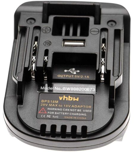 vhbw - the clever way Adattatore per batteria di ricambio di alta qualità per il Suo utensile elettrico L'adattatore per batteria di vhbw è adatto a strumenti come trapani, martelli perforatori, smerigliatrici, avvitatori a batteria, reggiatrici, ma anche a radio, seghe a mano o decespugliatori.Con questo adattatore è possibile utilizzare qualsiasi batteria ricaricabile da 20 V con tecnologia Li-Ion come una batteria plug-in in dispositivi che richiedono invece batterie da 18 V. CONTENUTO DELLA SPEDIZIONE: - 1x adattatore per batteria SPECIFICHE TECNICHE: - Per batterie con tensione: 20 V - Per batterie con tipo di cella: Li-Ion - Colore: nero COMPATIBILE CON: - Porter Cable - Makita, dispositivi che funzionano con batterie ricaricabili NiMH da 18 V Accessori e pezzi di ricambio di alta qualità. Per prolungare la durata di vita dei Suoi apparecchi elettrici. ...