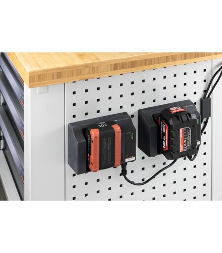 Descrizione Esecuzione: Attualmente l'altezza dei nostri banchi da lavoro può essere regolata anche mediante batterie per elettroutensili. Grazie al nuovo GARANT easyFix Flex Power, le batterie di 22 produttori di elettroutensili possono essere utilizzate per fornire un'alimentazione mobile al banco da lavoro. Con 3 numeri d'ordine per banco da lavoro regolabile in altezza con batterie per elettroutensili: Dati tecnici Tipo di prodotto Caricabatterie ...