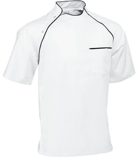 65% poliestere, 35% cotone. 200 g/m², lavaggio a 60°C. Casacca da cuoco resistente e di tendenza, a maniche corte, spacchetti laterali e chiusura asimmetrica con bottoni a pressione. Bordino a contrasto su maniche e colletto. Taglio dritto. Lunghezza posteriore: 75 cm nella taglia 50 ...