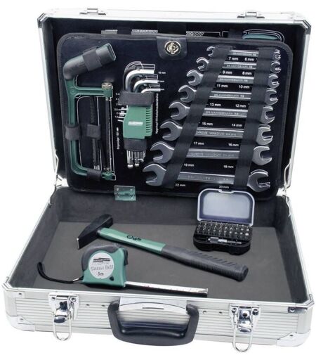 Dettagli tecnici Colore Argento Materiale Alluminio Settore di utilizzo Tuttofare Kit di attrezzi in valigetta di alluminio 108 pezzi Quando si è in viaggio, è sempre necessario avere a portata di mano l’attrezzo di qualità giusto. Punti di forza e dettagli 10 anni di garanzia del produttore Incluso nella consegna Leva a cricco con raccordo 1/4 (6,3 mm) e 3/8 (10 mm) (marchio GS) Prolunghe da 75 e 150 mm (marchio GS) 20 chiavi a tubo tra le più comuni (marchio GS) 30 inserti (marchio GS) nel magazzino inserti Supporto per micro inserti (marchio GS) Verificatore di fasi (marchio GS) 8 cacciaviti (marchio GS) 5 pinze (marchio GS) Lima (marchio GS) Taglierina (marchio GS) dotata di 10 lime sostitutive Sega ad archetto (marchio GS) 6 lame sostitutive per sega 9 chiavi a perni con testa a sfera (marchio GS) nel magazzino apribile 8 chiavi a forchetta 6 fino a 22 mm (GS testato) Metro a nastro 5 m Martello 300 g (marchio GS). Requisiti di sistema null ...