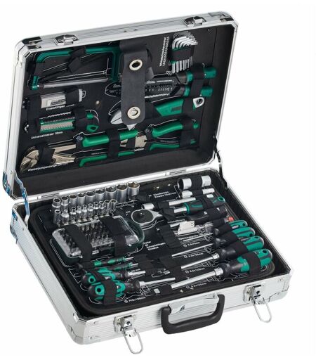 Set da 124 attrezzi con valigetta in alluminio. Garantita 10 anni. All'interno della valigetta: 6 X Giraviti, CV-acciaio, 2 X Giraviti di precisione CV-acciaio, 1 X cercafase, 1 X adattatore, 1 X cricchetto 10mm (3/8”), 2 X prolunghe CV-acciaio, 1 X Adattatore per chiavi a bussola, 9 X chiavi a bussola, CV-acciaio, con adattatore 10mm (3/8”), 8 X chiavi a bussola, CV-acero, con adaptador 6,3mm (1/4”), 1 X adattatore per chiavi a bussola + adattatore per bit, 61 pz di punte assortite, 1 X tenaglia 250mm, 1 X pinza di 180mm, 1 X pinze pela cavo, 1 X chiave inglese regolabile, 1 X taglierina, con 10 lame di ricambio, 8 X chiavi a brugola con supporto, 1 X seghetto con 6 lame da ferro, 1 X valigetta in alluminio. ...
