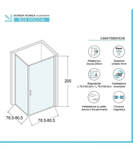 Cabina doccia angolare reversibile con vetro 6 mm,installazione reversibile e chiusura magnetica La linea Ted propone una vasta gamma di box doccia e porte a nicchia in cui l’eleganza del cristallo temperato con differenti finiture di vetro si unisce ai profili cromati ,per una cabina doccia pratica e versatile da installare sia filo pavimento che su piatto doccia. Il box doccia Ted è una cabina con lato fisso e porta a battente con chiusura magnetica,installazione reversibile e tolleranza di regolazione pari a 2 cm ,ideale per ottimizzare eventuali pareti fuori squadro. L’apertura a battente della porta è accompagnata da pratica maniglia dentro-fuori in acciaio cromato. Box doccia 80x80 cm caratteristiche tecniche: Tipologia:box doccia angolare; Linea:Ted; Materiale:cristallo temperato; Profili in alluminio cromato e vetro trasparente 6 mm; Dimensioni:L 80 x p 80 x H 200 cm; Tolleranza di regolazione 2 cm; Porta a battente con maniglia in acciaio cromato; Installazione REVERSIBILE e ...
