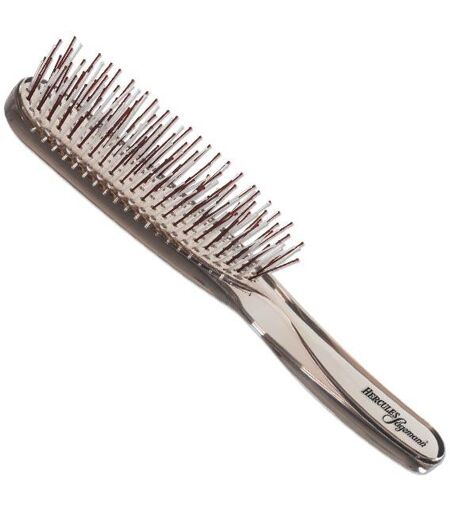 La spazzola per ogni capello. Le spille di nylon di alta qualità, specialmente arrotondate, in una disposizione speciale, districano e ordinano i capelli e sono delicate sul cuoio capelluto. Questa spazzola è veloce e delicata da usare, anche su capelli molto danneggiati e aggrovigliati. Nessuna lacerazione o strappo. Adatto a tutti i tipi di estensione. I perni appositamente disposti, molto fini e morbidi, mettono fine ai fastidiosi strappi. Adatto alla diffusione dei prodotti di cura, ogni colpo di spazzola favorisce la circolazione del sangue e quindi la crescita dei capelli. Lunghezza circa 21,5 cm. ...