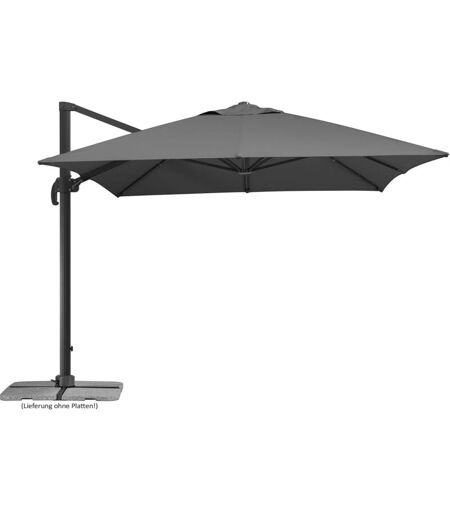 Rivestimento: 100% poliestere, circa 200 g/m², resistente alla decomposizione, idrorepellente, impregnato con air-vent, senza balze, con custodia protettiva con cerniera e asta. Telaio: telaio in alluminio grigio antracite verniciato a polvere, bastone monoblocco 57 x 93 mm, montanti circa 17 x 25 mm, con piatto girevole con pedale girevole girevole a 360°, inclinabile – con supporto per piastre da strada 50 x 50 x 5 cm (consegna senza piastre). Protezione UV: 50+ eccellente secondo AS/NZS 4399: 1 996 Dimensioni: 99Il lato lungo di 400 cm si trova in modo paragonale al supporto e il lato più corto di 300 cm viene misurato verso il retro dell'asta (prospettiva di visualizzazione dalla parte anteriore). ...