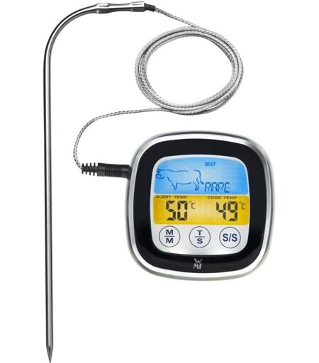 Descrizione Questo WMF termometro per arrosti serve per misurare la temperatura o il grado di cottura degli alimenti durante la cottura, quindi ideale anche per tutti i maestri del barbecue come termometro per barbecue. La barra di misurazione è realizzata in acciaio inossidabile, il cavo di misurazione lungo 60 cm è resistente al calore. Il funzionamento avviene tramite un display touch a LED con un indicatore di temperatura da -20° a + 250° (selezionabile tra gradi Celsius (°C) e gradi Fahrenheit (°F). Il termometro ha 5 livelli di cottura (rare, medio rare, medio, medio well) per 7 tipi di carne. La temperatura viene misurata mettendo la punta del sensore di almeno 1,5 cm di profondità nella parte più spessa della carne. Se la temperatura misurata è uguale o superiore a quella impostata, emettono segnali acustici. I suoni di avviso si attenuano non appena la temperatura misurata scende al di sotto di quella impostata. Il termometro da cucina ha una funzione timer con allarme ...