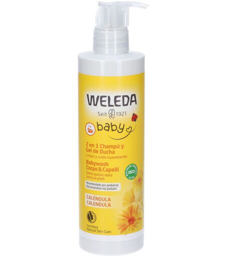 Weleda Baby 2in1 Bagnodoccia Bagnodoccia a base di estratto di calendula biologica, per una dolce pulizia di corpo e capelli. Può essere utilizzato anche in presenza di crosta lattea. Modo d'uso: Applicare su corpo e capelli, poi risciacquare bene con acqua tiepida. Ingredienti: Water (Aqua), Sesamum Indicum (Sesame) Seed Oil, Coco-Glucoside, Alcohol Denat., Disodium Cocoyl Glutamate, Glycerin, Sodium Cocoyl Glutamate, Calendula Officinalis Flower Extract, Prunus Amygdalus Dulcis (Sweet Almond) Oil, Carrageenan, Lactic Acid, Xanthan Gum, Parfum (Fragrance), Beta-Caryophyllene, Cananga Odorata Oil/Extract, Citrus Aurantium Peel Oil, Geraniol, Geranyl Acetate, Lavandula Oil/Extract, Limonene, Linalool, Linalyl Acetate. ...