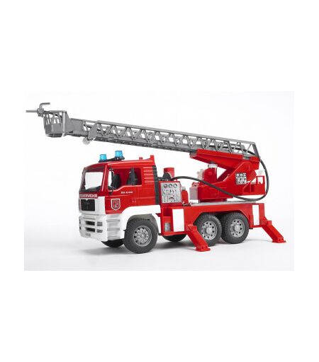 Riproduzione fedele del prodotto reale, in scala 1:16. La cabina ribaltabile del camion dei pompieri MAN con scala e autopompa consente la vista del blocco motore. Gli specchietti della cabina sono estraibili, e il serbatoio d'acqua integrato puo' essere riempito. I flessibili possono essere estesi e presentano all'estremita' un getto d'acqua pienamente funzionale. La scala, comprensiva di una piattaforma di soccorso, puo' essere azionata mediante un apposito meccanismo a ruota, e anche regolata in altezza. Quattro blocchi stabilizzatori garantiscono il pieno appoggio del mezzo. La confezione include il modulo Light and Sound, cod. art.: 02801, con 4 diverse funzioni: segnali acustici; rombo del motore; luce lampeggiante e sirena. A completare il quadro, i pneumatici scolpiti. ...