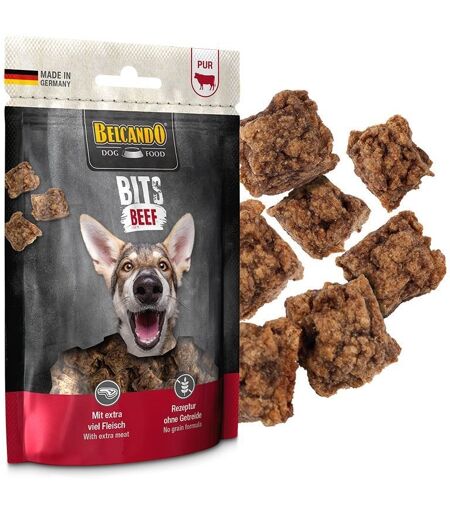 Snack Belcando Bits al Manzo 90g. Bocconcini naturali monoproteici, senza cereali né zuccheri, delicatamente essiccati all’aria per gusto e digeribilità. ...