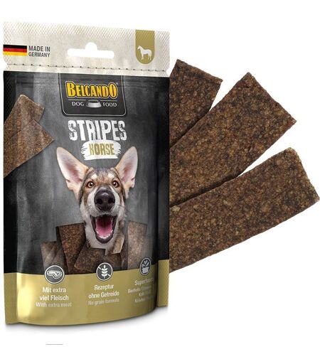 Snack Belcando Stripes al Cavallo 90g. Strisce naturali con carne di cavallo, krill e lievito di birra. Grain free, ricche di proteine, sane e facilmente digeribili. ...