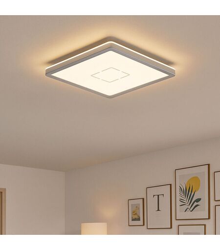 Descrizione Questa plafoniera LED quadrata colpisce per il suo look moderno e la sofisticata tecnologia di illuminazione. Con dimensioni compatte di 29,3 x 29,3 cm e un'altezza complessiva di soli 2,8 cm, è la soluzione ideale per le stanze con soffitti di altezza limitata. La cornice argentata in combinazione con il corpo illuminante opalino conferisce all'apparecchio un design discreto ed elegante. D a LED installata in modo permanente emette una luce bianca neutra, fornendo un'illuminazione chiara e uniforme, particolarmente adatta per aree di lavoro, corridoi o cucine. La retroilluminazione integrata crea un sottile bagliore sul soffitto, che migliora ulteriormente l'atmosfera dell'ambiente. Grazie al suo aspetto semplice, l'apparecchio si integra armoniosamente in un'ampia varietà di stili abitativi. L'alimentazione è fornita direttamente da 230V a 50Hz, per garantire una semplice installazione. Questa lampada a LED combina un'illuminazione funzionale con un design elegante ...