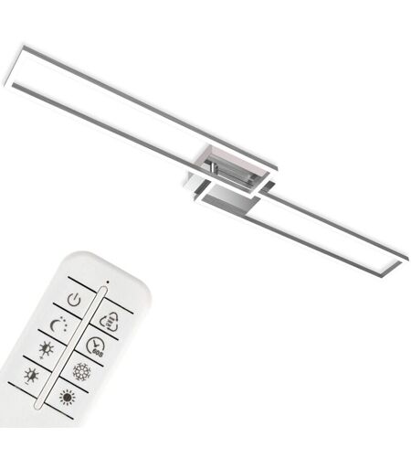 Questo moderno soffitto a LED con due moduli LED rettangolari (uno dei quali ruota), realizzati in metallo plastico, può essere utilizzato in vari modi grazie al metallo in look alluminio spazzolato e al supporto in metallo cromato della calotta a z luci. B. Come lampada da salotto o da camera da letto: grazie alla dimmerabilità e alla regolazione della temperatura di colore (2700 Kelvin - 5. 000 Kelvin), è possibile adattare la lampada a un'ampia gamma di ambienti. 000 Kelvin), è possibile adattare le condizioni di illuminazione alle proprie esigenze e necessità - l'ultima impostazione selezionata viene salvata (funzione di memoria) - ulteriori vantaggi di questa semplice plafoniera sono la funzione di luce notturna e il timer integrato - utilizzando il telecomando chiuso, è possibile controllare comodamente il soffitto del divano - con 40 watt di energia, i due moduli LED hanno una potenza luminosa di 400 lumen e creano una luce piacevole - l'elevata durata media è di circa 25.000 ...