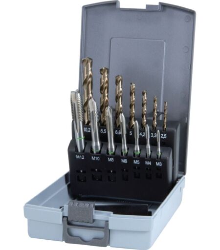 HSS-Co · M3 - M12 composto da: 1 pezzo ciascuno MGB DIN 371 M3/ M4/ M5/ M6/ M8/ M10 DIN 376 M12 1 pezzo ciascuno di trapano a spirale Ø 2,5/ 3,3/ 4,2/ 5,0/ 6,8/ 8,5/ 10,2 mm ...