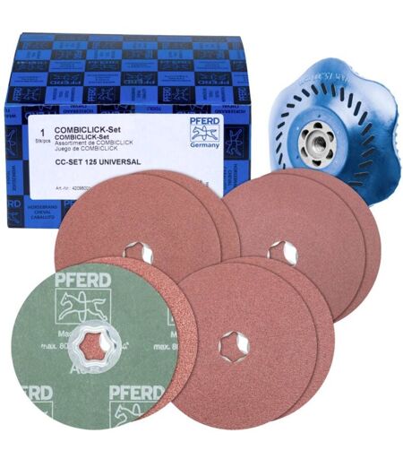 PFERD Tools 42098001 Kit di dischi in fibra di legno combiclick Korund Ø125mm A36, 60, 80, 120 con piastra di supporto -