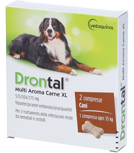 Codice Aic: 104701077Drontal Multi Aroma Carne XL 2 compresse cani XLOgni compressa contiene principi attivi: 525 mg febantel; 175 mg pirantel equivalenti a 504 mg di pirantel embonato; 175 mg praziquantel.INDICAZIONETrattamento delle infestazioni miste da nematodi e cestodi delle specie seguenti. Nematodi: ascaridi (adulti e forme immature tardive): toxocara canis, toxascaris leonina; ancilostomi (adulti): uncinaria stenocephala, ancylostoma caninum; trichiuridi (adulti): trichuris vulpis. Cestodi (adulti e forme immature): echinococcus granulosus; Echinococcus multilocularis; dipylidium caninum; taenia spp.CONTROINDICAZIONINon usare in caso di ipersensibilita' ai principi attivi o ad uno degli eccipienti. Non usare durante il primo e il secondo terzo di gravidanza .Precauzioni D´IMPIEGOLe pulci fungono da ospiti intermedi per un tipo comune di cestode: dipylidium caninum. L'infestazione da cestode si presentera' nuovamente, se non si attua un controllo degli ospiti intermedi, come pulci, topi, ecc. Precauzioni speciali per l'impiego negli animali: la resistenza di un parassita a una particolare classe di antielmintici puo' svilupparsi in seguito all'uso frequente, ripetuto di un antielmintico di tale classe. Per minimizzare il rischio di reinfestazione o di nuova infestazione, si devono raccogliere gli escrementi ed eliminarli adeguatamente per 24 ore dopo il trattamento. Precauzioni speciali che devono essere adottate dalla persona che somministra il prodotto medicinale veterinario agli animali: in caso di ingestione accidentale, rivolgersi immediatamente ad un medico mostrandogli il foglietto illustrativo o l'etichetta. Ai fini di una buona igiene, coloro che somministrano il prodotto direttamente a un cane o aggiungendolo al cibo del cane devono in seguito lavarsi le mani. Altre precauzioni: poiche' contiene praziquantel, il prodotto e' efficace contro Echinococcus spp.che non sono presenti in tutti gli stati membri della UE, ma che stanno diventando piu' comuni in alcuni. L'echinococcosi rappresenta un rischio per l'uomo. Poiche' l'echinococcosi e' una malattia da notificare alla Organizzazione Mondiale per la Sanita' Animale (Oie), si devono ottenere dalla relativa autorita' competente le specifiche linee guida sul trattamento, il follow-up e la salvaguardia dell'uomo. Dosi di prodotto 10 volte quelle raccomandate sono state tollerate da cani e cuccioli senza segni di reazioni avverse. Incompatibilita' principali: non pertinente.INTERAZIONIGli effetti antielmintici di questo prodotto e dei prodotti contenenti piperazina possono essere antagonizzati quando i due farmaci sono usati insieme.AVVERTENZE SPECIALIEffetti teratogeni attribuiti ad alte dosi di febantel, somministrate durante le prime fasi della gravidanza, sono stati segnalati nei ratti, nelle pecore e nei cani. La sicurezza del prodotto non e' stata studiata durante il primo e il secondo terzo della gravidanza. Non usare in cagne gravide durante il primo e il secondo terzo della... ...